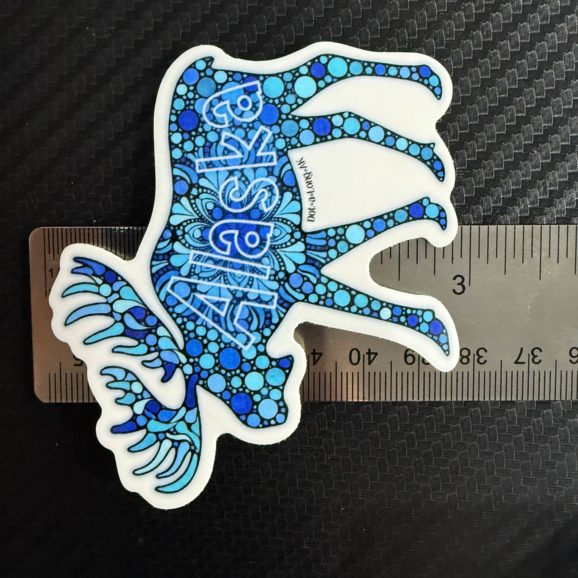 Designed with Jenny's Kenai River color palette, this glossy die-cut sticker is an adaptation of a larger original artwork. Ideal for those whole want something Alaska themed and are lovers of moose and all things blue. This sticker crosses mandalas and Jenny’s love for these giant animals who frequent her yard. Stickers make for an affordable way to have a piece of Jenny’s journey with dots.