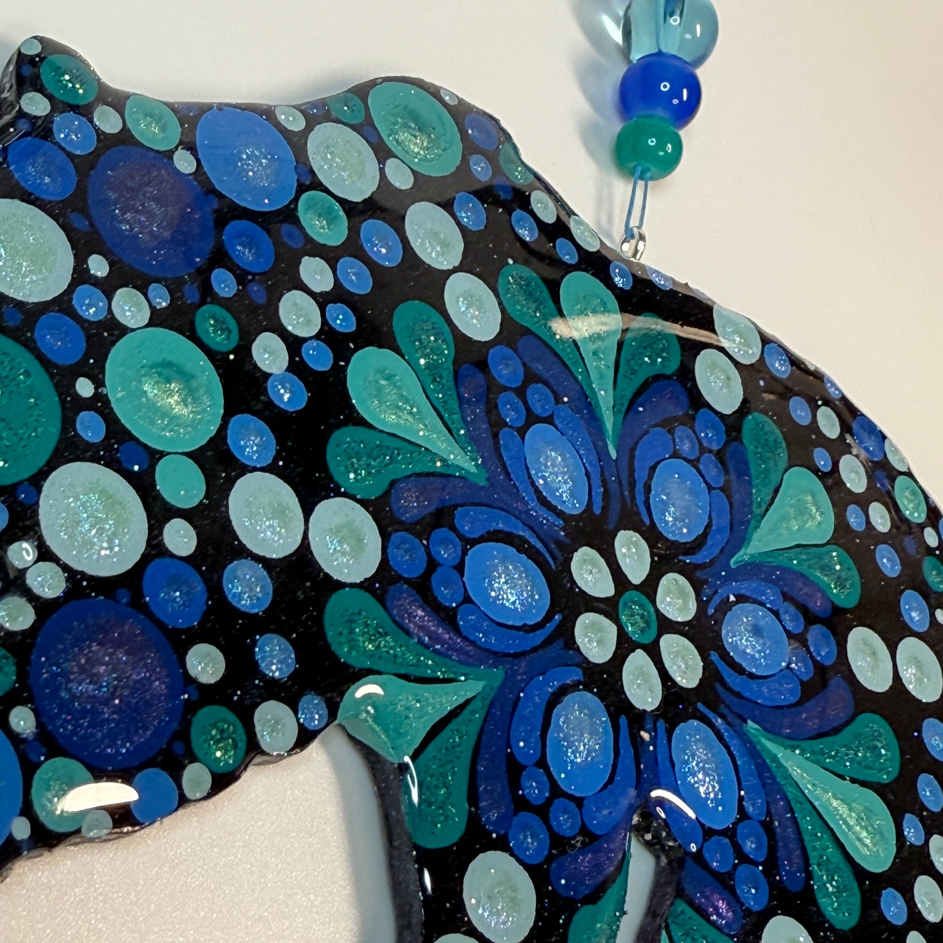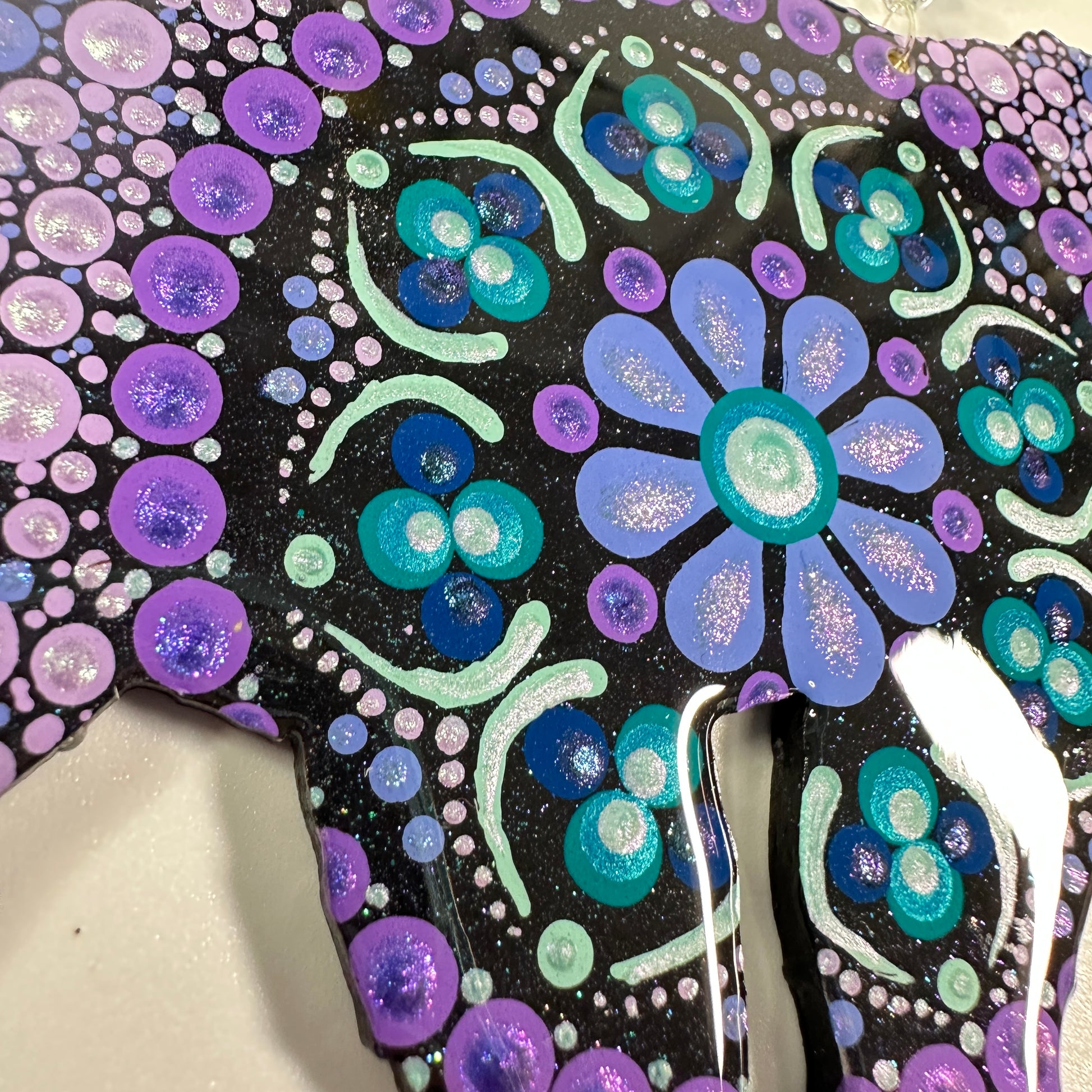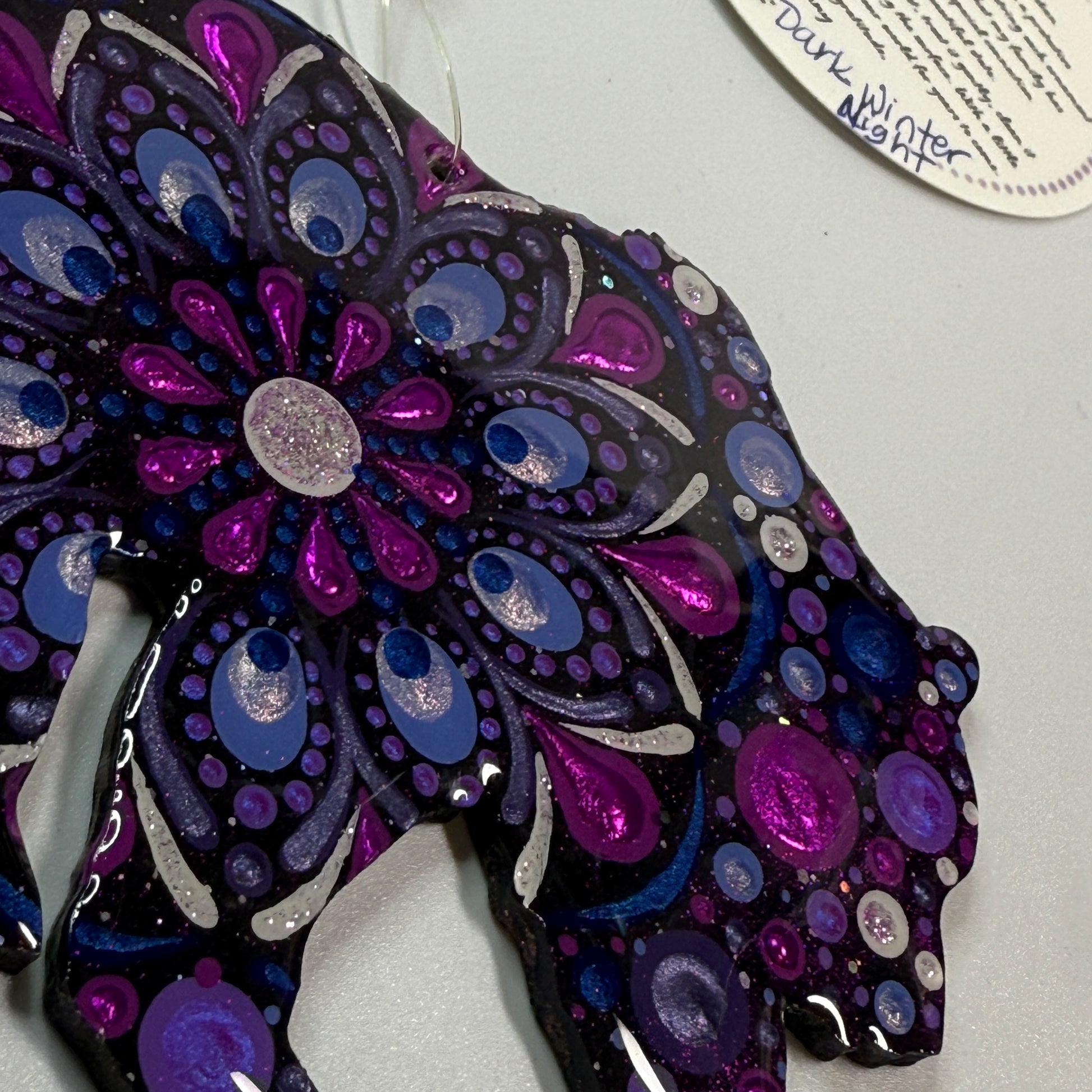 This beefy hand painted grizzly ornament will be created just for you after purchase, making it piece truly one of a kind. Painted using the dot mandala method, it features Jenny’s signature shimmer and sparkle, which may not fully show in photos but will be beautifully visible in person.