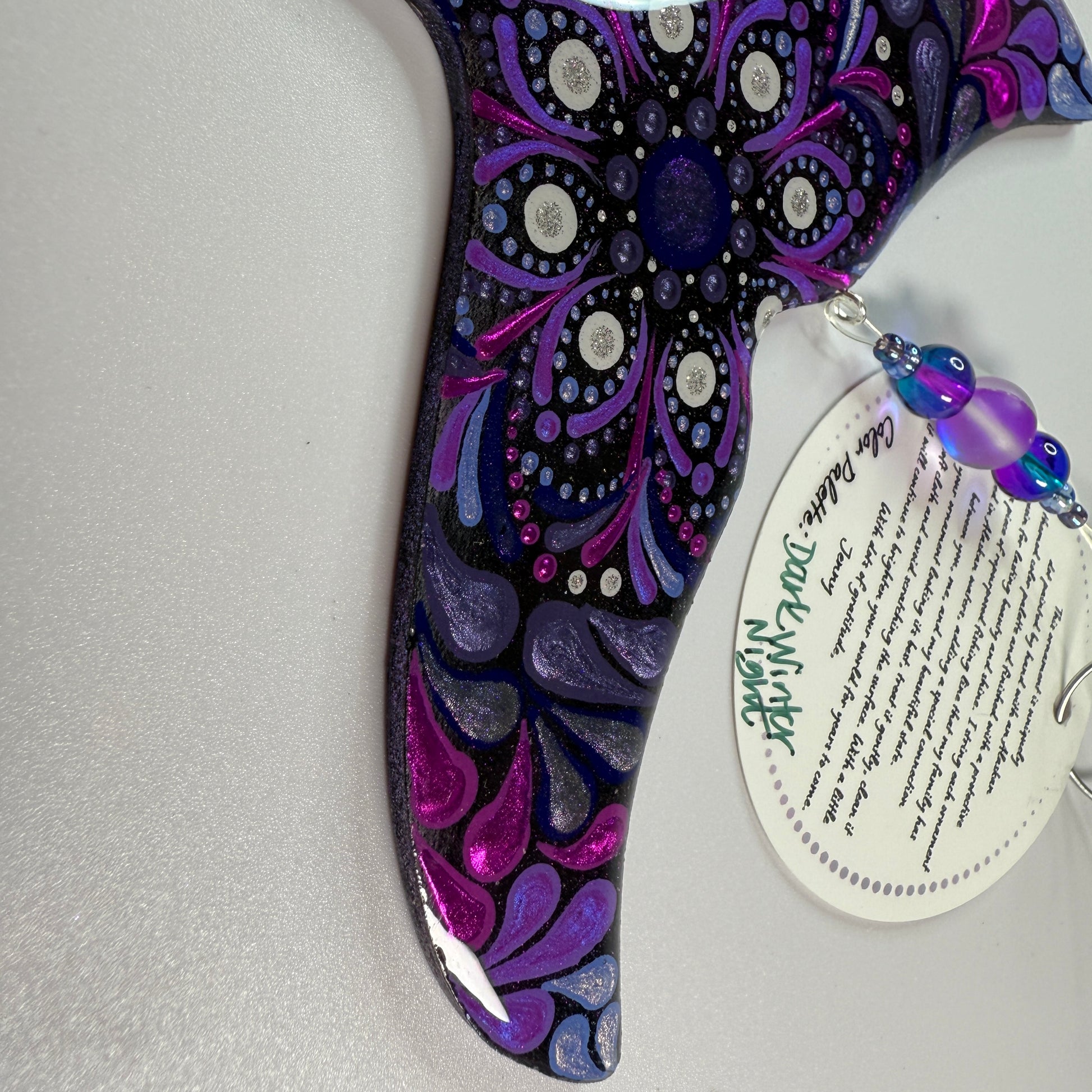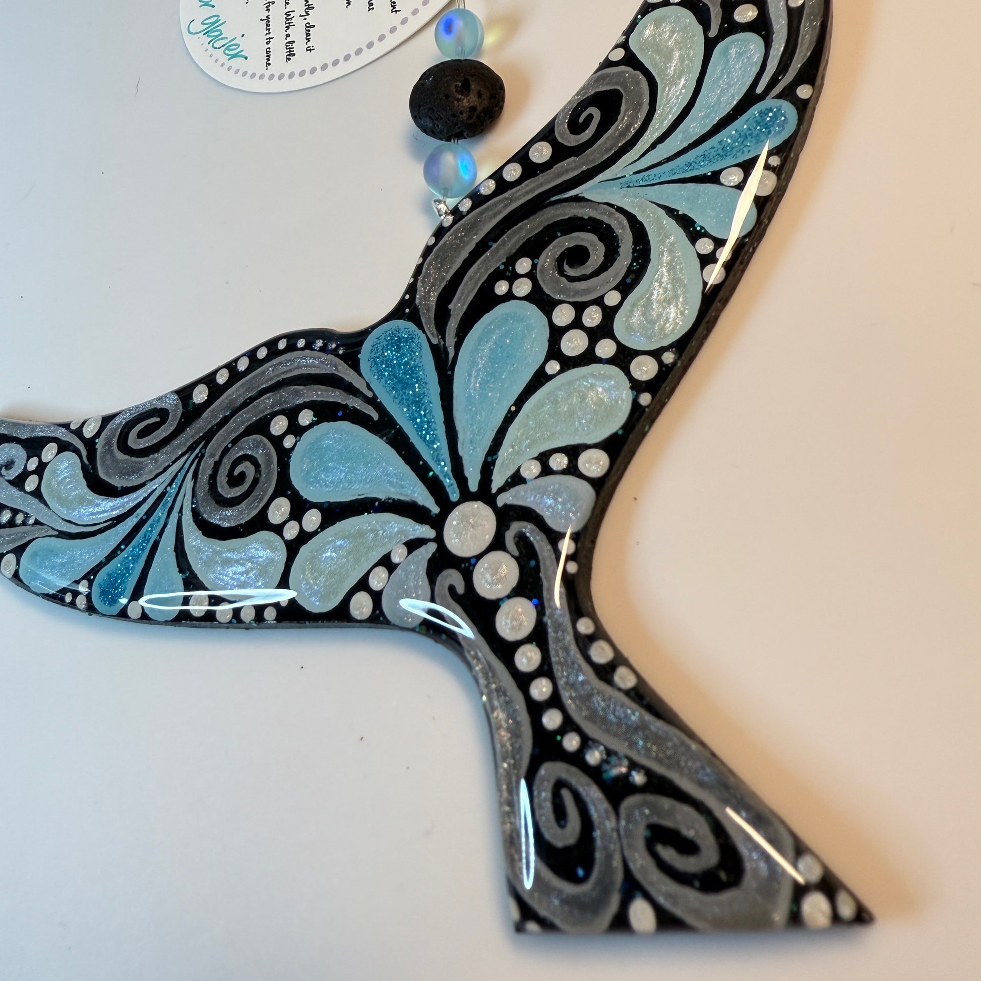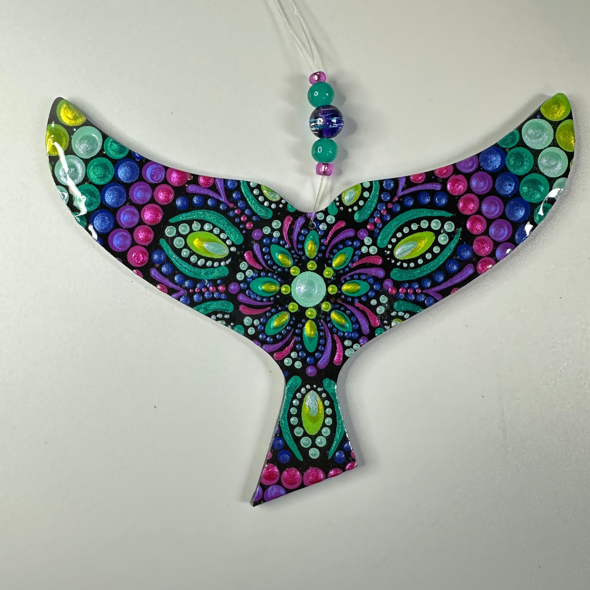 This hand painted whale tail ornament will be created just for you after purchase, making each piece truly one of a kind. Painted using the dot mandala method, it features Jenny’s signature shimmer and sparkle, which may not fully show in photos but will be beautifully visible in person.