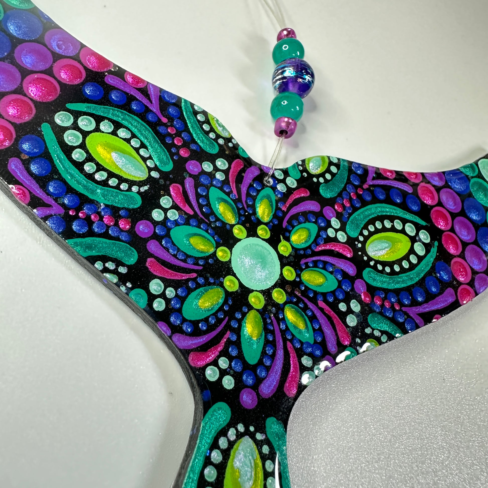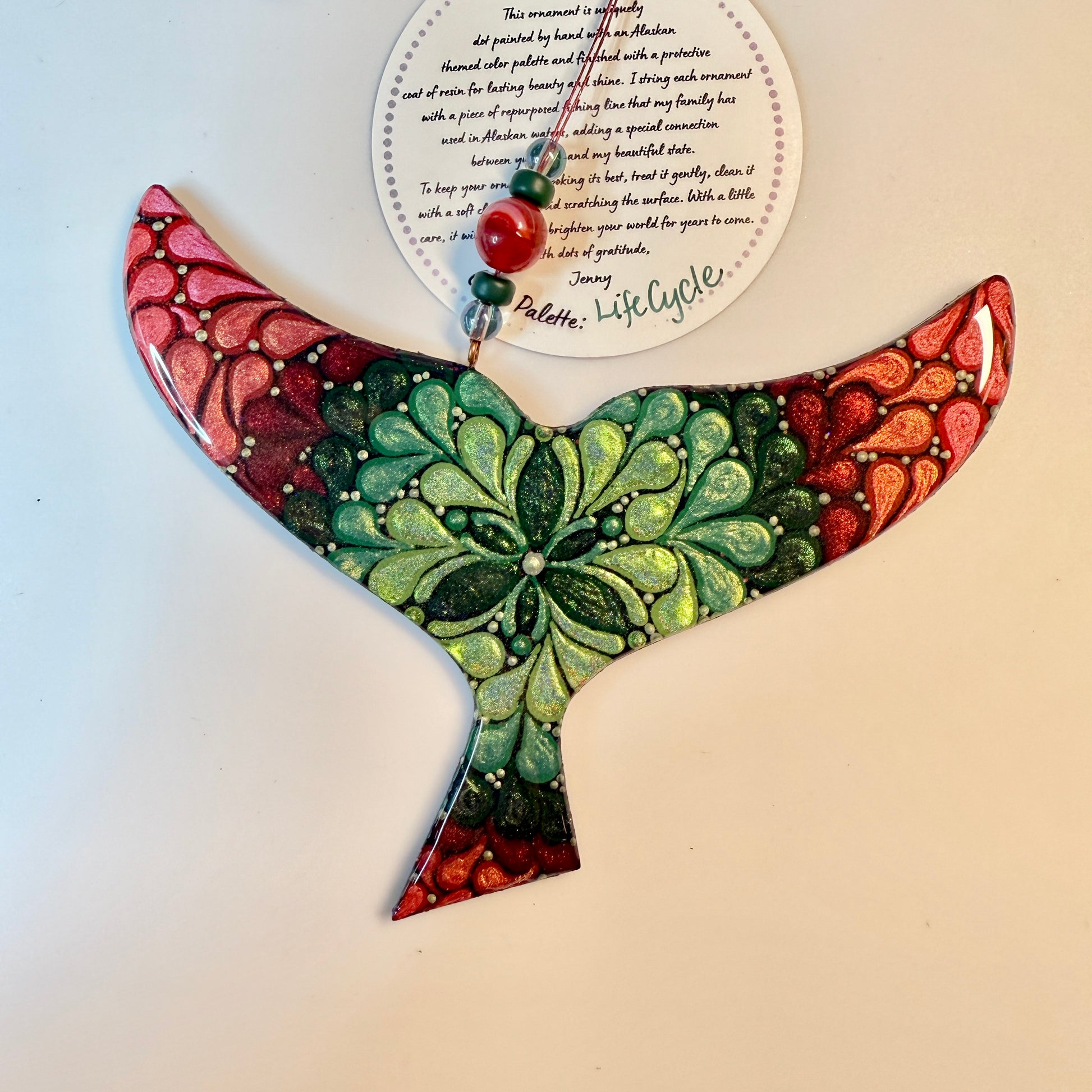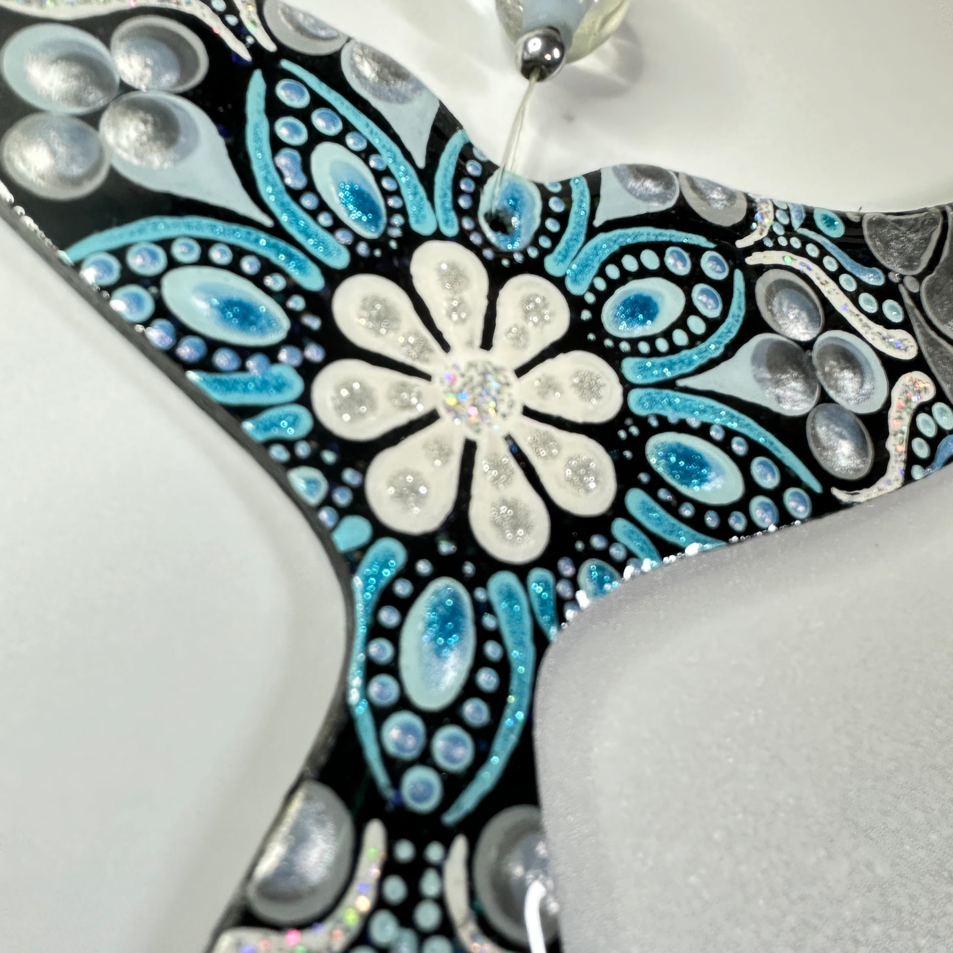 This hand painted whale tail ornament will be created just for you after purchase, making each piece truly one of a kind. Painted using the dot mandala method, it features Jenny’s signature shimmer and sparkle, which may not fully show in photos but will be beautifully visible in person.