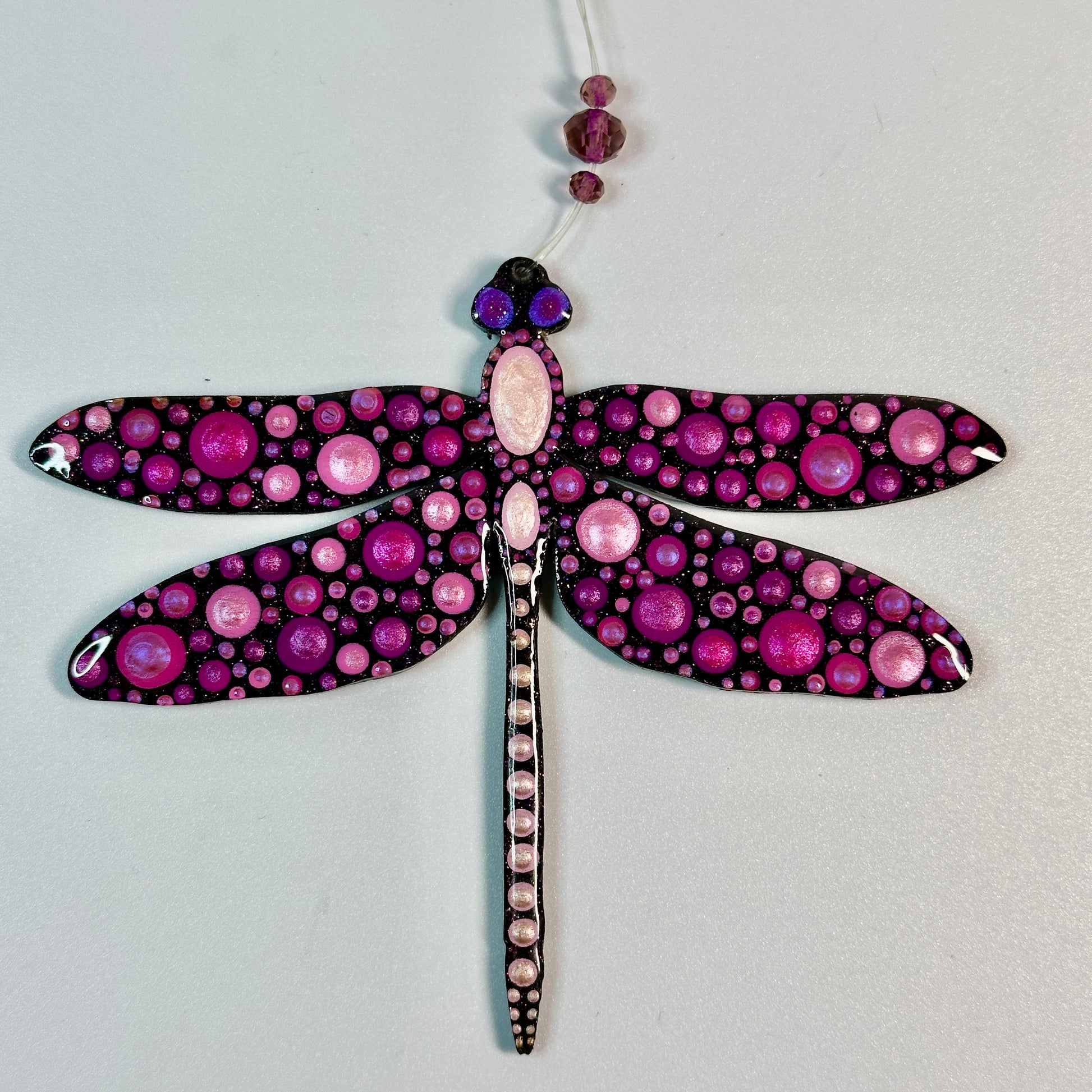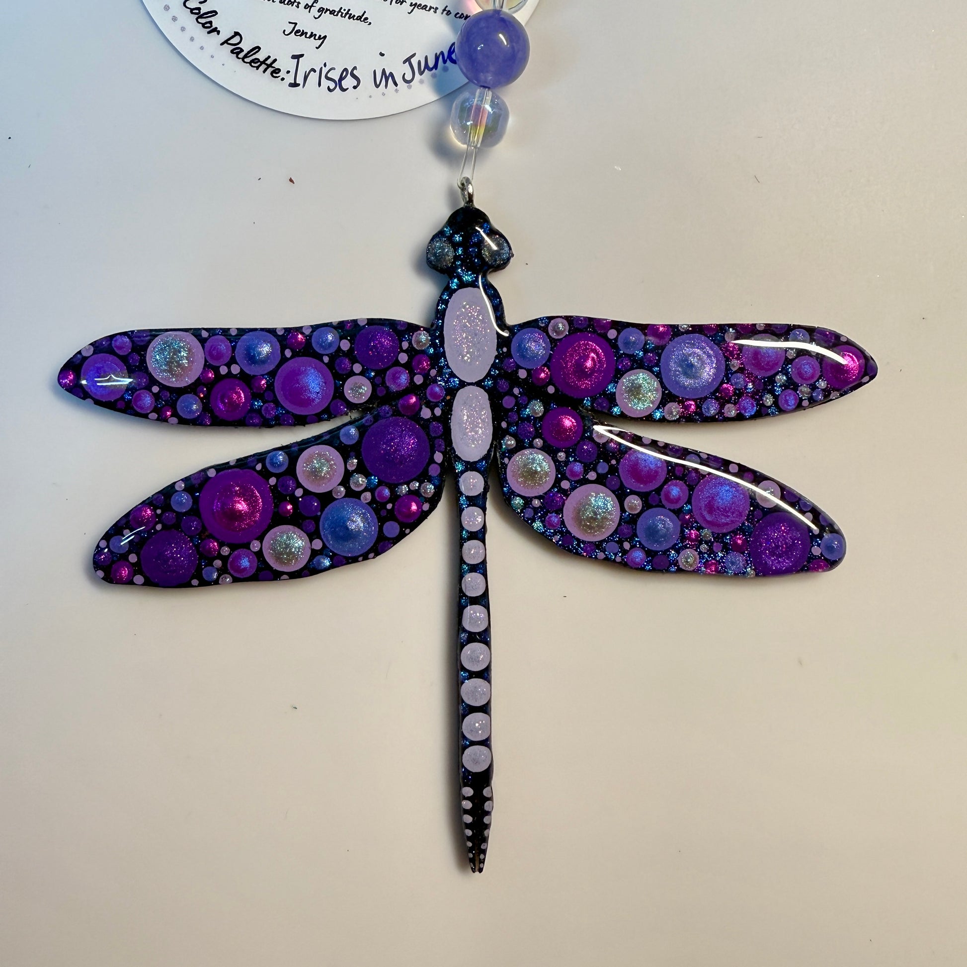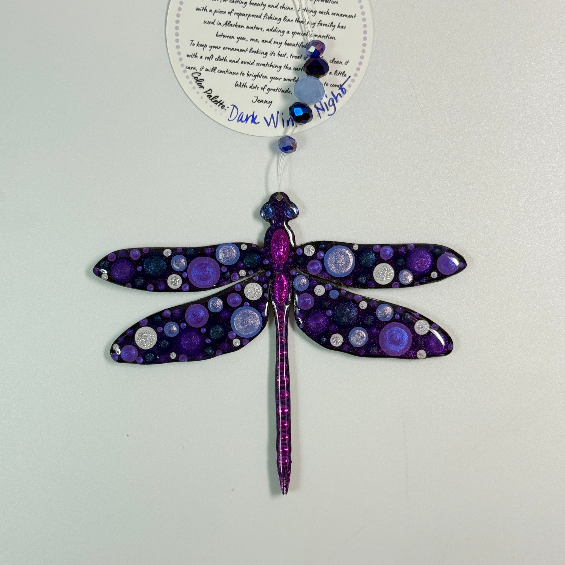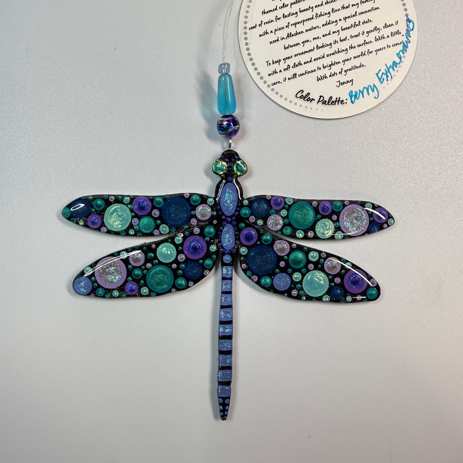 This hand painted dragonfly ornament will be created just for you after purchase, making each piece truly one of a kind. Painted using the cluster dot method, it features Jenny’s signature shimmer and sparkle, which may not fully show in photos but will be beautifully visible in person.