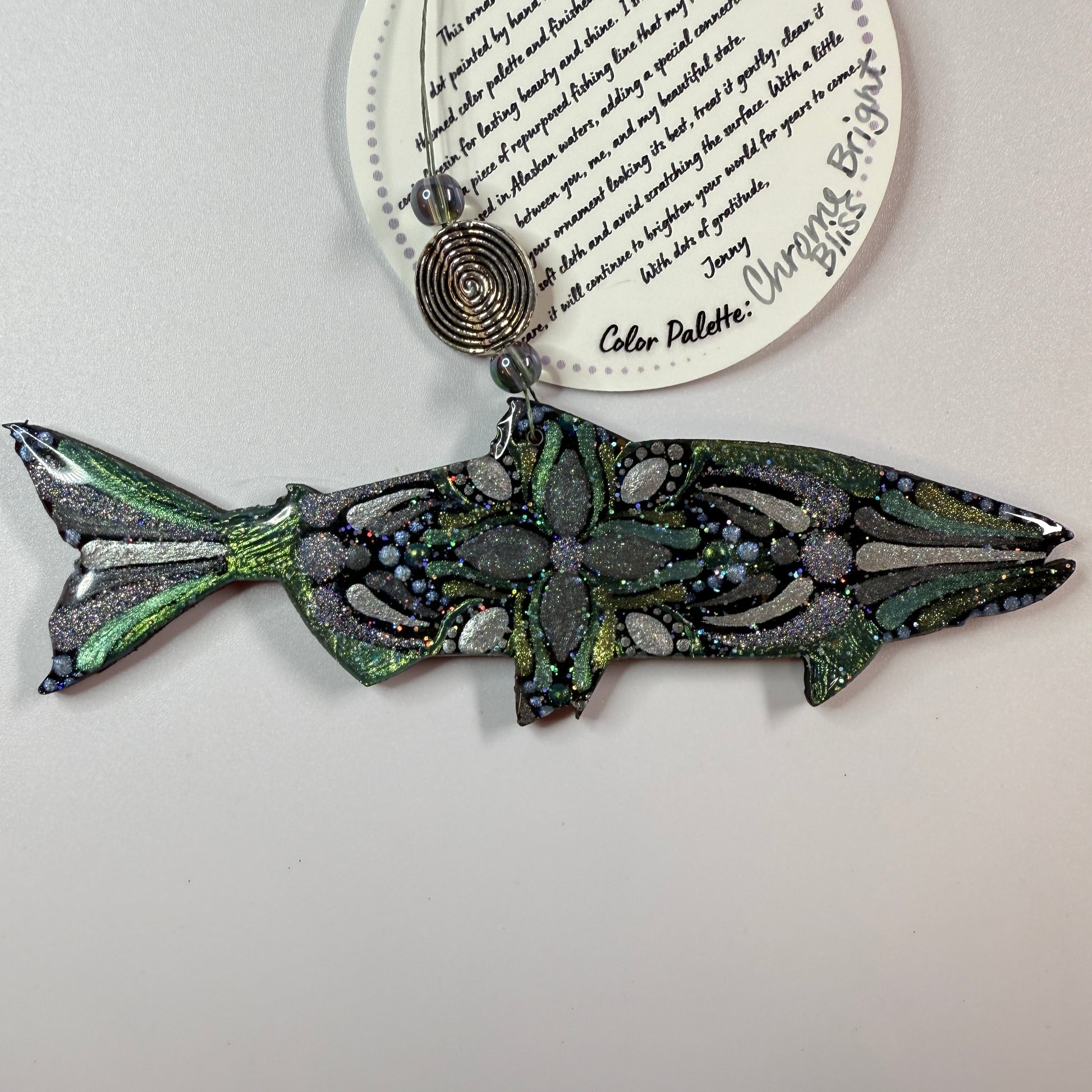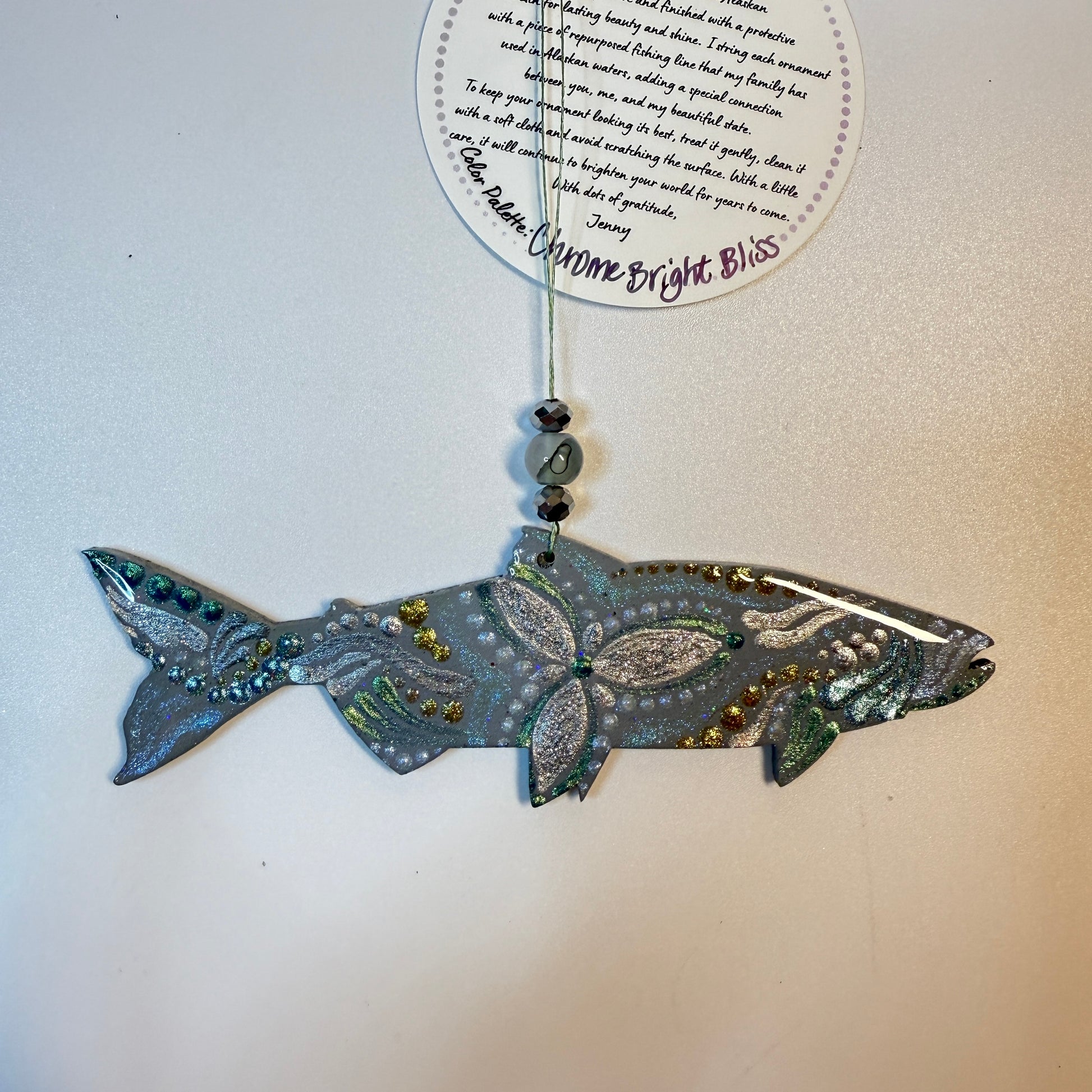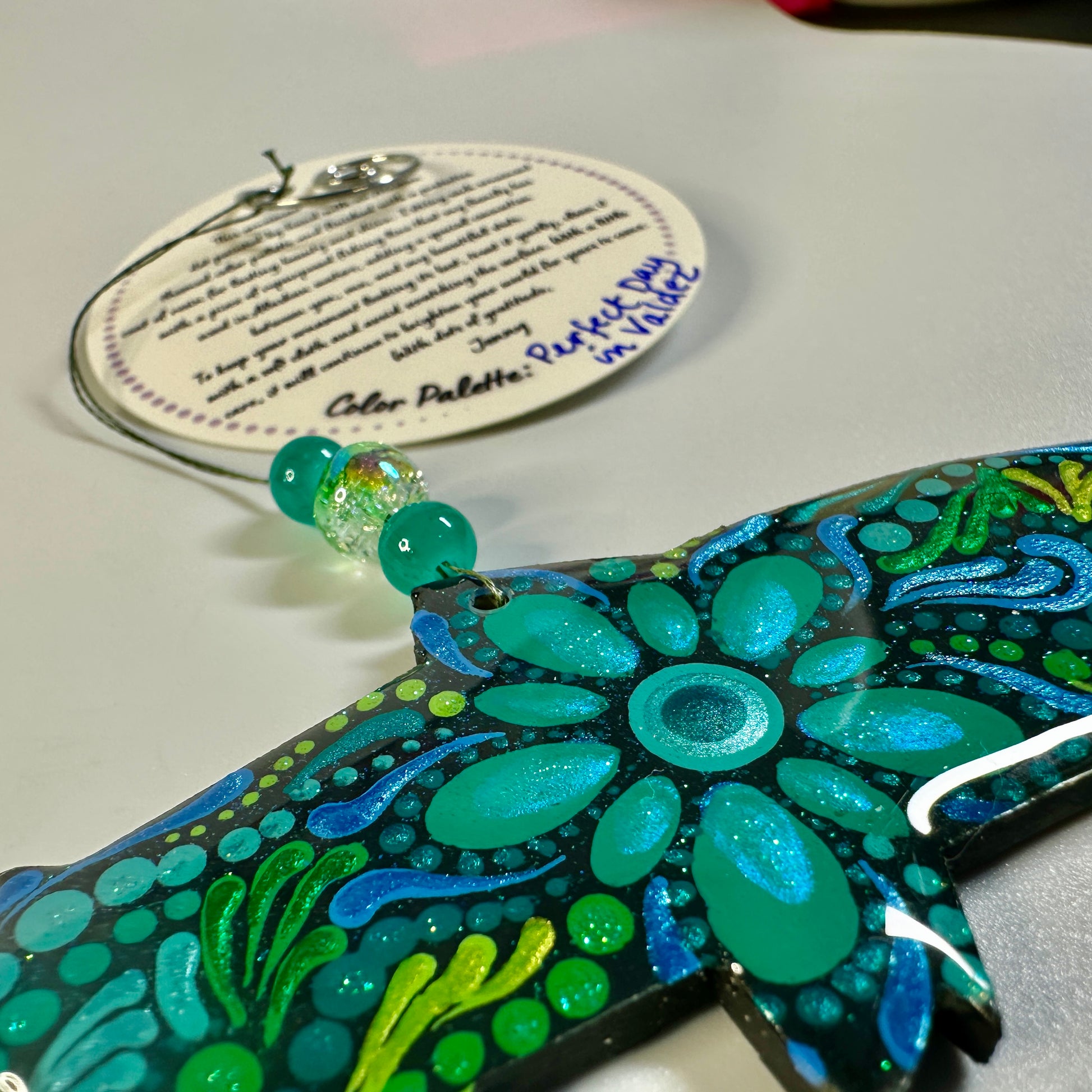This hand painted salmon ornament will be created just for you after purchase, making each piece truly one of a kind. Painted using the dot mandala method, it features Jenny’s signature shimmer and sparkle, which may not fully show in photos but will be beautifully visible in person.