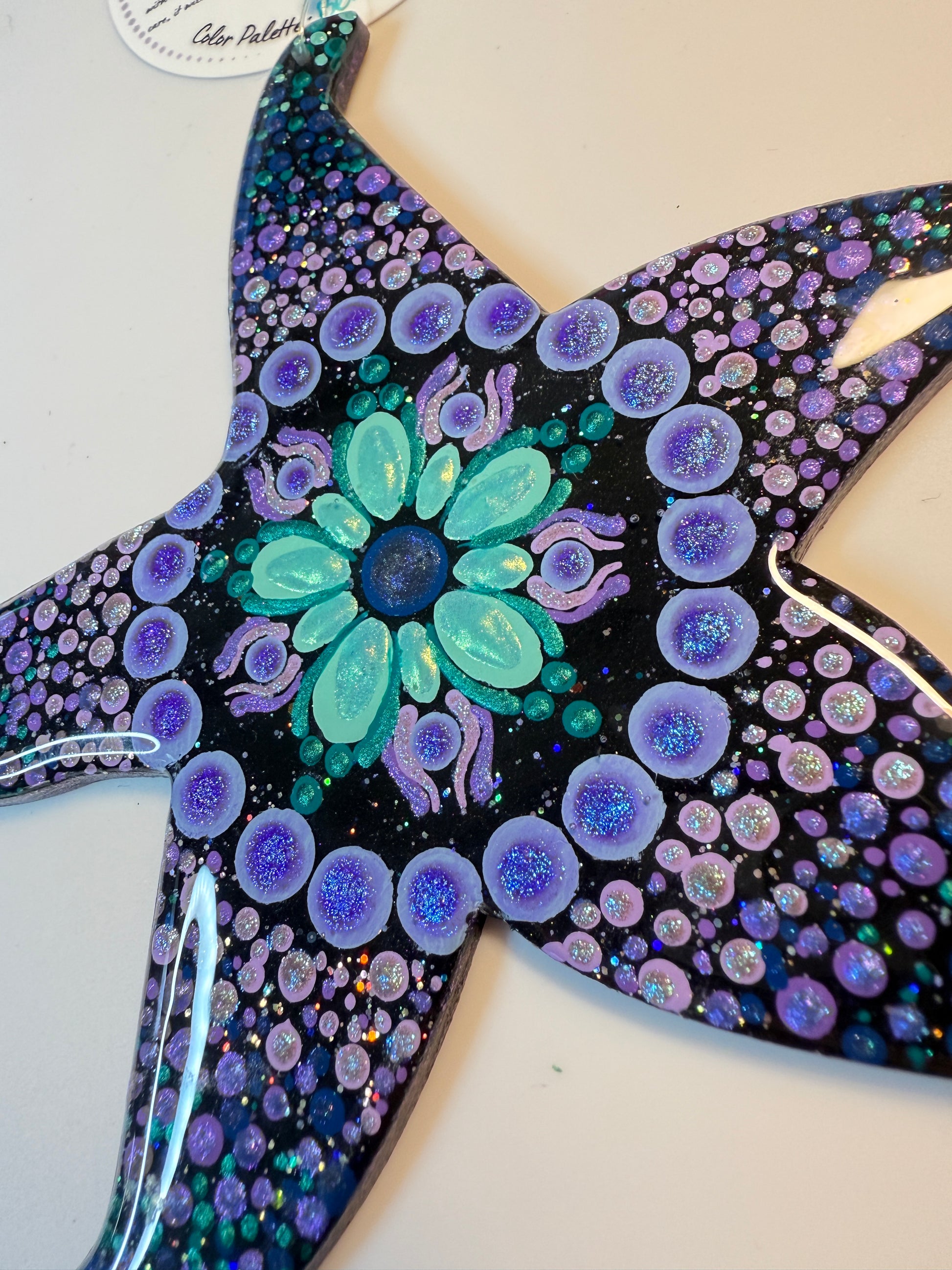 This hand painted starfish ornament will be created just for you after purchase, making each piece truly one of a kind. Painted using the dot mandala method, it features Jenny’s signature shimmer and sparkle, which may not fully show in photos but will be beautifully visible in person.